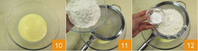 Vous devez obtenir un mélange homogène et clair 10. Incorporez maintenant la farine tamisée avec un tamis 11 ainsi que la levure 12. Mélangez délicatement avec une spatule.
