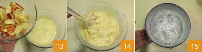 Pour finir, incorporez les pommes aromatisées à l'orange 14. Beurrez et farinez un moule de 20 cm de diamètre 15 et versez-y la pâte.