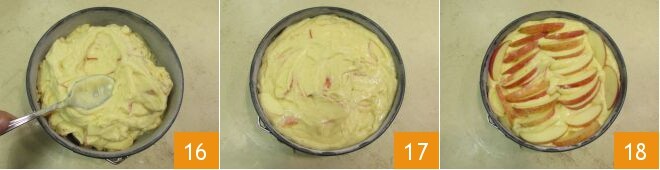 Nivellez la surface avec le dos de la cuillère 16 pour obtenir une surface homogène 17. À ce stade, récupérez les tranches de pommes mises de côté pour la décoration et disposez-les côte à côte pour couvrir tout le gâteau 18.