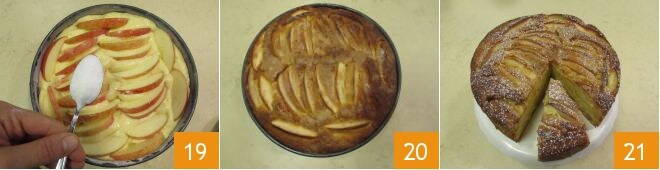 Saupoudrez la surface de sucre semoule 19 et faites cuire dans un four statique préchauffé à 175° pendant 70 minutes, jusqu'à ce qu'il soit bien doré 20. Une fois la cuisson terminée, sortez le gâteau pomme-orange du four et servez-le en le garnissant de sucre glace selon votre goût 21.