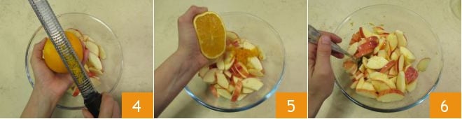 Assaisonnez les tranches irrégulières de pommes avec le zeste 4 et le jus d'orange 5, mélangez et mettez de côté 6.