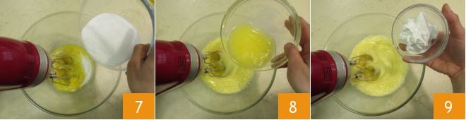 Dans un bol, versez les œufs et battez-les avec le fouet électrique en ajoutant les 200 g de sucre petit à petit 7. Ajoutez ensuite le beurre fondu refroidi 8 et le yaourt grec 9, en continuant de mélanger.