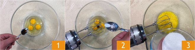 Pour réaliser le gâteau renversé aux pêches, commencez par préparer la pâte : faites fondre le beurre dans une petite casserole et laissez tiédir. Dans un grand bol, versez les œufs, l'extrait de vanille 1 et le sel 2. Commencez à fouetter avec un batteur électrique, puis ajoutez le sucre 3. Continuez à travailler jusqu'à obtenir un mélange mousseux.