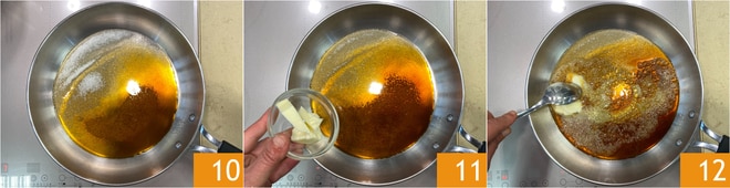 Pour préparer le caramel, versez le sucre dans une poêle à fond épais et faites-le fondre à feu très doux, sans le toucher 10. Lorsqu'il atteint une belle couleur ambrée, ajoutez le beurre 11 et mélangez avec une cuillère 12.