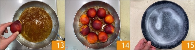 Disposez les pêches dans la poêle de manière à ce que la partie coupée soit en contact avec le caramel 13 et laissez-les ainsi pendant une minute, puis éteignez le feu 14. Pendant ce temps, beurrez et saupoudrez de sucre un moule de 21,5 cm de diamètre à la base et de 24 cm en surface 15.