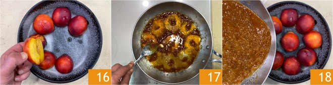Retirez les pêches de la poêle et transférez-les dans le moule, toujours avec la partie coupée vers le bas 16. Mélangez le caramel restant dans la poêle 17 et versez-le sur les pêches 18.