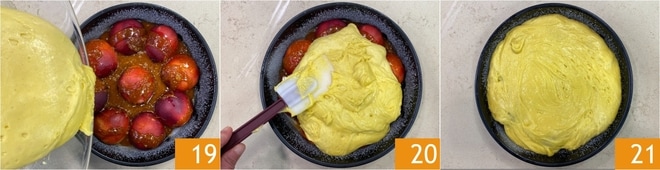 Enfin, versez aussi la pâte 19 et égalisez la surface avec une spatule 20. Faites cuire dans un four statique préchauffé à 175° pendant 45 minutes 21.