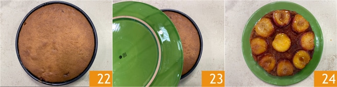 À la fin de ce temps, vérifiez la cuisson avec un cure-dent et sortez du four 22. Démoulez immédiatement le gâteau en le retournant sur le plat de service, en faisant attention à ne pas vous brûler 23. Laissez tiédir et servez votre délicieux gâteau renversé aux pêches, accompagné si vous le souhaitez d'une boule de glace à la vanille 24 !