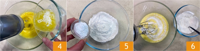 À ce stade, versez le beurre fondu tiédi en filet, tout en continuant de battre 4. Mélangez la farine et la levure dans un autre bol 5, puis incorporez progressivement les poudres au mélange 6.