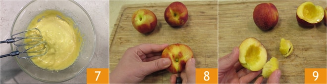 Continuez à travailler jusqu'à obtenir une pâte lisse et homogène 7. Mettez de côté et occupez-vous des pêches : lavez-les et coupez-les en deux 8, puis retirez le noyau 9.