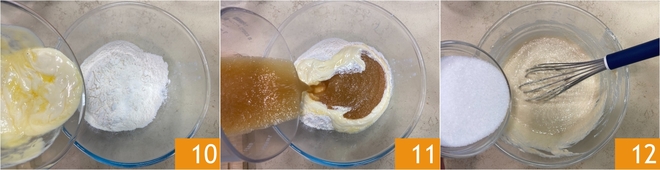 Versez la farine dans un bol et ajoutez le beurre végétal, que vous aurez fait fondre préalablement 10 et la purée de pommes 11. Mélangez bien avec un fouet, puis ajoutez le sucre 12.