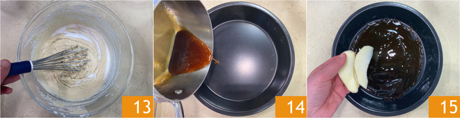 Mélangez encore pour obtenir un mélange homogène 13. Versez maintenant le caramel chaud dans un moule de 22 cm de diamètre à la base et de 25 cm en surface 14, puis répartissez les pommes en tranches de manière à couvrir tout le fond 15.