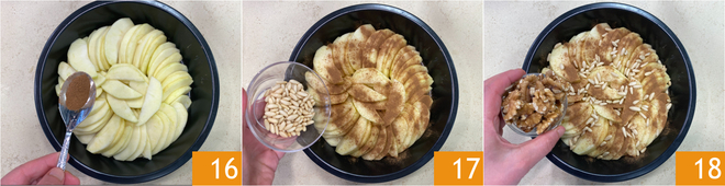 Saupoudrez les pommes de cannelle 16, de pignons de pin 17 et de noix hachées grossièrement 18, en veillant à garder des fruits secs de côté pour la décoration.