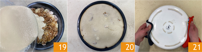 À ce stade, recouvrez les pommes avec la pâte 19 et faites cuire dans un four statique préchauffé à 180°C pendant environ 45 minutes 20. Vérifiez la cuisson avec un cure-dent, puis sortez du four et renversez immédiatement le gâteau en vous aidant d'une assiette et en faisant attention à ne pas vous brûler 21.