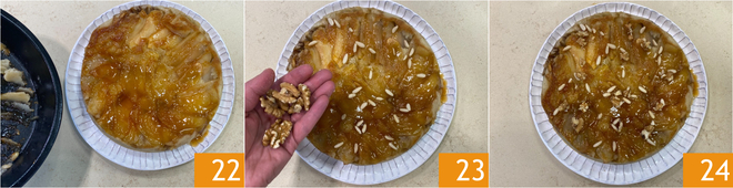 Retirez délicatement le moule 22 et laissez refroidir. Garnissez la surface avec les pignons de pin et les noix réservés 23 et servez votre gâteau renversé aux pommes vegan 24!
