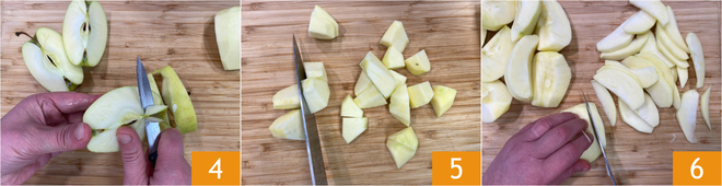 Pendant ce temps, nettoyez les pommes 4 : coupez 200 g de pulpe en gros dés 5 et le reste en fines tranches 6, que vous mettrez de côté.