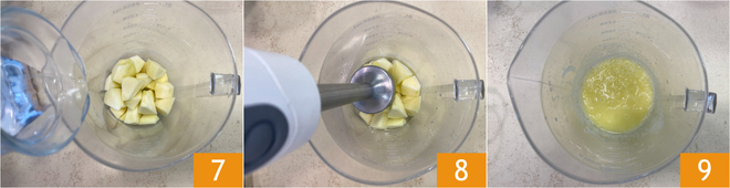 Transférez les pommes en dés dans un bol, ajoutez l'eau 7 et mixez avec un mixeur plongeant 8 pour obtenir une purée 9.
