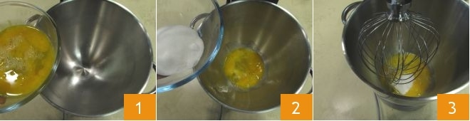 Pour préparer le gâteau ricotta et poires, commencez par faire fondre 75 g de beurre à feu très doux et laissez-le tiédir. Pendant ce temps, versez les œufs dans un batteur équipé de fouets 1, ajoutez le sucre 2, 1/3 des graines de la gousse de vanille et commencez à fouetter à vitesse modérée 3 ; montez pendant environ 10 minutes.