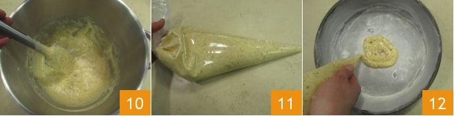 Mélangez de bas en haut pour l'incorporer 10, puis versez la pâte obtenue dans une poche à douille avec une embout lisse 11. Préchauffez le four à 205°C en mode statique. Beurrez et farinez deux moules de 22 cm de diamètre, puis créez une couche de pâte au fond, en partant du centre avec un mouvement en spirale 12.