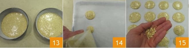 et en vous élargissant petit à petit sur toute la surface : ainsi, vous obtiendrez deux bases parfaites 13. À ce stade, avec la pâte restante, vous pouvez réaliser des petits biscuits qui serviront pour la décoration finale du gâteau : posez une feuille de papier sulfurisé sur une plaque, puis commencez à former des disques avec la pâte restante, en les espaçant de quelques centimètres, pour qu'ils ne se collent pas pendant la cuisson 14. Il en sortira environ une vingtaine. Saupoudrez-les de praliné de noisettes 15.