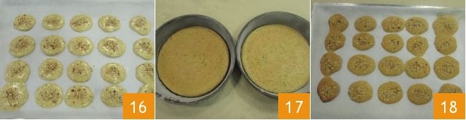 Maintenant, vous avez également les biscuits prêts 16. Les bases devront cuire dans un four statique préchauffé à 205°C pendant 13 minutes ; les biscuits seulement 6 minutes. Une fois prêts (17-18), laissez reposer pour qu'ils refroidissent complètement.