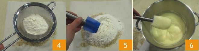 Sur une feuille de papier sulfurisé, transférez la farine de noisettes de Giffoni, tamisez la farine T45 par-dessus 4 et mélangez avec une spatule pour les amalgamer 5. Lorsque vous aurez obtenu un mélange d'œufs et de sucre bien monté, clair et mousseux 6,