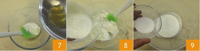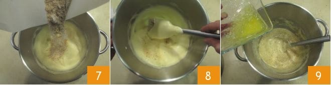 incorporez les poudres en deux fois 7, mélangeant avec la spatule de haut en bas pour les incorporer sans démonter le mélange 8, puis ajoutez en filet le beurre fondu refroidi à température ambiante 6.