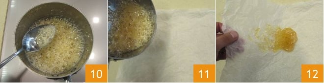 et laissez mijoter jusqu'à obtenir un caramel blond. Prenez une feuille de papier sulfurisé et froissez-la ; quand le caramel sera prêt 10, versez-en une petite partie sur le papier sulfurisé froissé 11 et laissez-le s'étaler pour créer une base irrégulière 12.