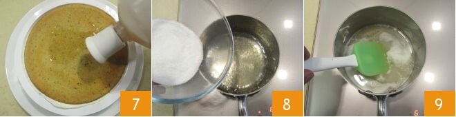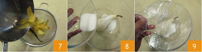Mélangez, puis vous pourrez filtrer 7, ainsi vous aurez le sirop prêt pour imbiber les bases du gâteau. Dans un bol, placez une poire entière épluchée (en laissant la queue) et recouvrez-la de sucre 8, faites tourner le bol pour que le sucre se répartisse sur la poire. Ensuite, couvrez d'un film alimentaire 9 et placez au réfrigérateur pendant au moins 1 heure. Puis passez-la au micro-ondes pendant 4 minutes à pleine puissance.