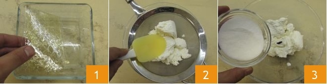 Placez la gélatine en feuilles dans un bol d'eau froide 1. Pendant ce temps, prenez la ricotta de bufflonne et de vache que vous avez laissée égoutter du petit-lait (même toute la nuit si nécessaire), passez-la au tamis 2, puis ajoutez les graines de vanille mises de côté avant et 80 g de sucre 3.