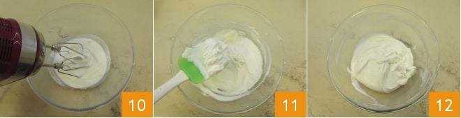 Montez la crème et le sucre avec les fouets d'un batteur électrique parfaitement propres 10. Ensuite, incorporez la crème à la crème de ricotta, d'abord en mélangeant énergiquement 11, puis le reste, en mélangeant délicatement de haut en bas pour ne pas démonter la crème. Vous obtiendrez ainsi votre crème lisse et veloutée 12. Vous pouvez la mettre dans une poche à douille jetable avec un embout lisse.