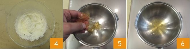 Mélangez le tout avec les fouets électriques 4. Placez la gélatine (légèrement essorée) dans un cul de poule posé sur une casserole, pour la faire fondre doucement au bain-marie (5-6).
