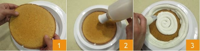 Maintenant, vous pouvez passer à la composition et la décoration du gâteau ricotta et poires : prenez un disque d'acétate de 22 cm (comme le diamètre des deux bases). Placez-le sur un plat de service et posez à l'intérieur un des disques 1. Imbibez avec le sirop aux poires 2, puis créez une couche de crème en la répartissant avec la poche à douille d'abord avec un ou deux tours sur le bord, les autres au centre 3.