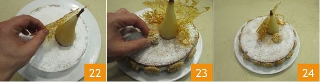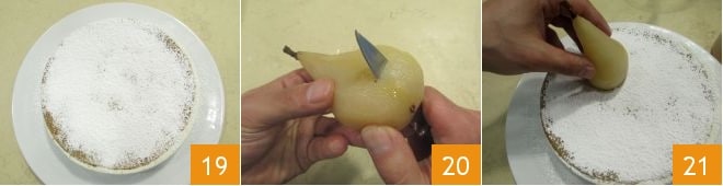 Poudrez le gâteau de sucre glace, puis coupez la base de la poire entière 20 et posez la poire sur le gâteau 21.