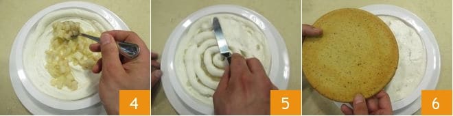 Répartissez les poires cuites 4, puis une autre couche de crème de ricotta et lissez pour uniformiser la couche 5. Placez l'autre disque pour couvrir 6,