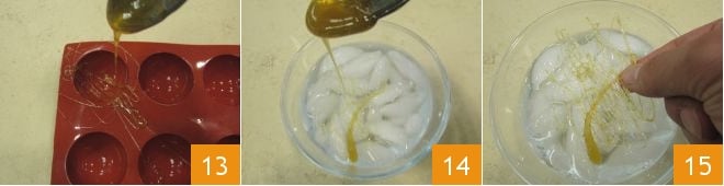 Laissez reposer le caramel restant pendant 1-2 minutes pour qu'il s'épaississe, et créez une décoration en dôme en répartissant des fils de caramel sur un moule en silicone à sphères 13. Ensuite, versez le reste toujours en filet dans un bol d'eau froide et de glace 14 pour qu'en se solidifiant, il crée d'autres décorations 15.