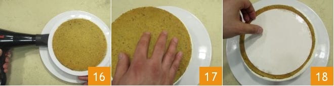 Après 2 heures, sortez le gâteau ricotta et poires du réfrigérateur : pour retirer plus facilement le disque d'acétate, vous pouvez chauffer avec un sèche-cheveux le bord extérieur 16, puis retournez le gâteau 17 et retirez à la fois le bord et la base 18.