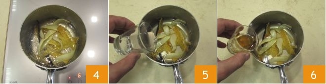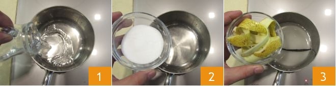 Versez l'eau dans une petite casserole 1 avec le sucre 2, la gousse de vanille privée des graines (que vous garderez de côté) et les épluchures de poires 3.