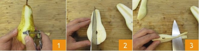 Lavez et épluchez les poires avec un épluche-légumes (gardez les épluchures de côté car elles vous serviront plus tard) 1 ; divisez les poires en deux 2, enlevez le cœur 3.