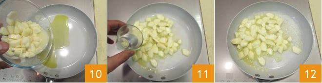 Dans une grande poêle, versez un filet d'huile d'olive extra vierge et laissez chauffer ; ajoutez les dés de poire 10 et mélangez. Cuisez pendant quelques minutes, puis ajoutez un peu d'eau et aromatisez avec les graines de 1/3 de gousse de vanille ; faites cuire encore quelques instants en remuant de temps en temps et déglacez avec le distillat de poires 11. Les poires doivent rester croquantes. Versez les poires cuites, encore chaudes, dans un bol, en récupérant bien le jus, et couvrez de film alimentaire. Laissez refroidir et en attendant, préparez le sirop de poires.