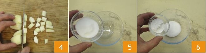 et coupez-les en dés 4. Placez les dés de poire dans un bol ; dans un autre, versez le sucre 5 et la fécule 6, mélangez-les ensemble