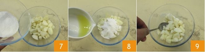 avant de verser le mélange sur les dés de poire 7. Ajoutez ensuite le jus de citron 8 et mélangez soigneusement 9.