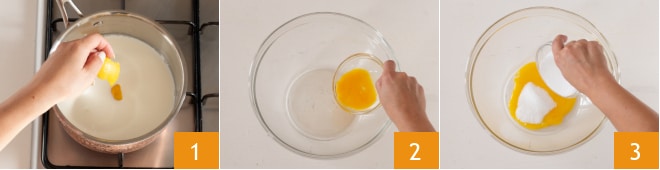 Pour réaliser le gâteau roulé, commencez par la préparation de la crème : chauffez le lait dans une casserole avec le zeste de citron 1. Pendant ce temps, dans un bol, versez les jaunes d'œufs 2 et le sucre 3.
