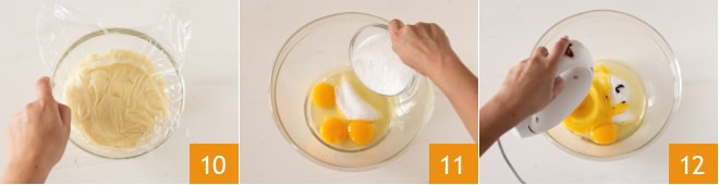 Ensuite, transférez la crème dans un bol, couvrez-la avec du film alimentaire 10, et laissez-la refroidir, d'abord à température ambiante puis au réfrigérateur. Préparez maintenant le gâteau : dans un saladier, versez les œufs avec le sucre 11, ajoutez les graines de la gousse de vanille et battez-les avec un batteur électrique 12 jusqu'à ce qu'ils soient gonflés et mousseux.