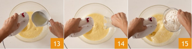 Ajoutez l'huile en filet 13, le lait 14 et enfin la farine et la levure 15.