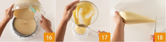 Versez la pâte dans un moule à charnière de 22 cm, préalablement beurré et fariné ou recouvert de papier sulfurisé 16; nivelez-la avec une spatule si nécessaire. À ce stade, reprenez la crème complètement refroidie et mettez-la dans une poche à douille 17 sans embout 18.