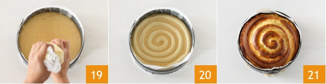 Réalisez une spirale sur la pâte 19 en partant du centre du gâteau 20. Faites cuire au four à 180°C pendant environ 35-40 minutes. Une fois cuit, sortez votre gâteau roulé du four et laissez-le tiédir avant de le servir 21 !