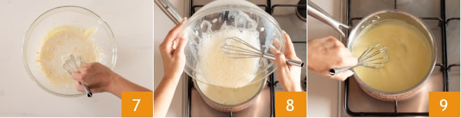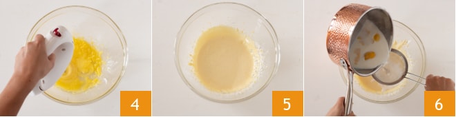 Battez les jaunes d'œufs avec le sucre 4 à l'aide d'un batteur électrique jusqu'à ce qu'ils soient gonflés et mousseux 5. Ajoutez la farine tamisée petit à petit, et mélangez, puis incorporez le lait chaud en filet, en le versant à travers une passoire pour retenir le zeste de citron 6.