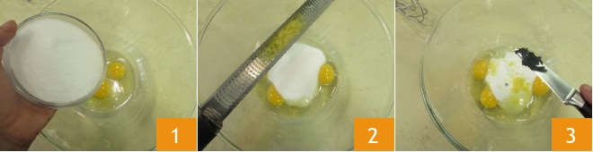 Pour réaliser le gâteau sans lait, versez dans un bol les œufs et le sucre 1, le zeste d'un demi-citron et les graines de la gousse de vanille 3.