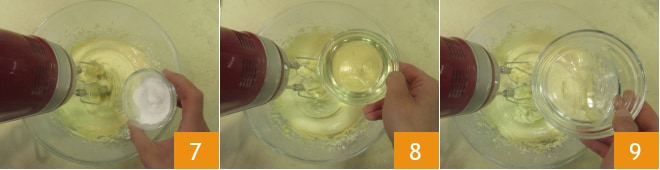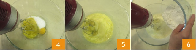 Avec les fouets électriques, travaillez le tout à vitesse moyenne 4 jusqu'à obtenir un mélange mousseux 5. Ensuite, ajoutez la farine d'un seul coup 6 et continuez à travailler pour qu'elle soit absorbée.
